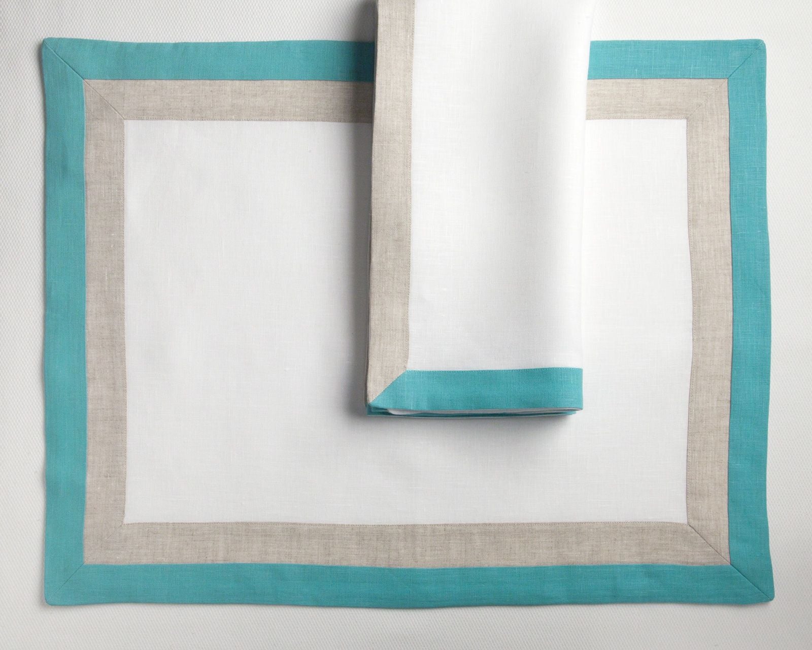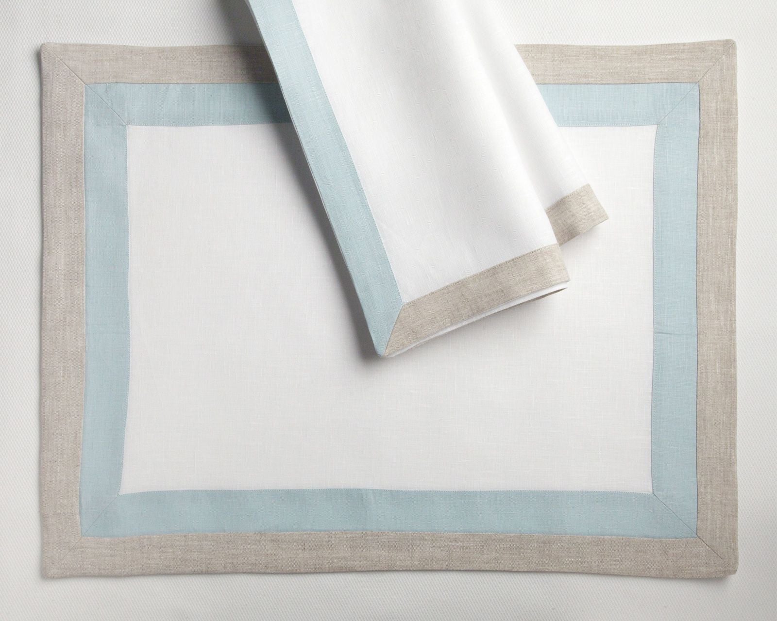 ANTIBES CAPRI is a tailored 100% linen placemat and napkin with a contrast border in two colors. To order, please check for available linen colors.