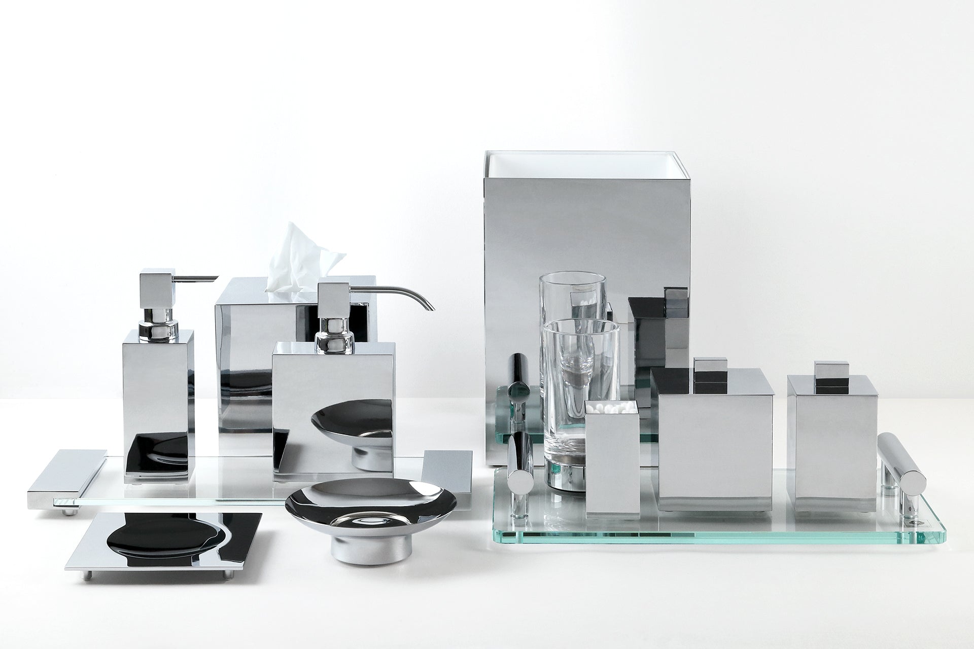 The CHROME bath accessory collection epitomizes discreet luxury in a modern, understated style. Soldered, polished, galvanized, and assembled by hand with a gleaming Chrome finish.