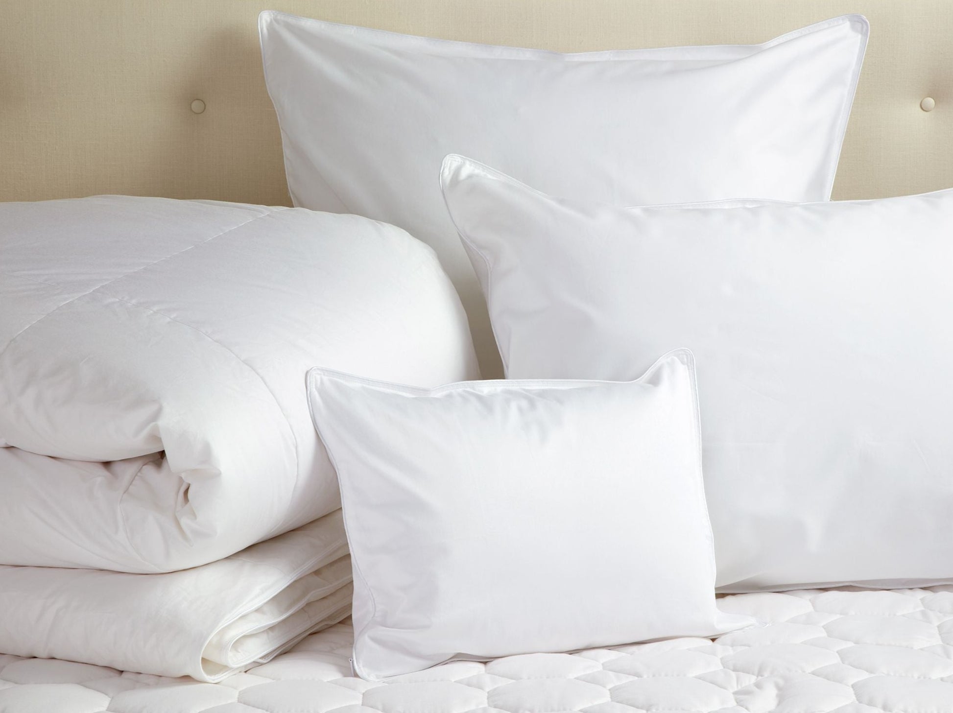 800 Fill Power Siberian White Goose Down filled pillows and comforters. Shown with our luxurious 100% cotton mattress pad.