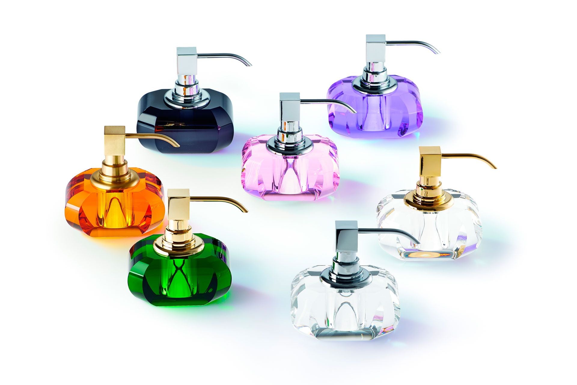 A piece that is bound to captivate wherever it's placed. The KRISTALL lotion pump dispenser is made of weighty glittering glass in brilliant jewel tones. Available in Emerald, Amber, Anthracite, Pink, Violet, and Clear. Choice of Chrome or Gold metal pump.