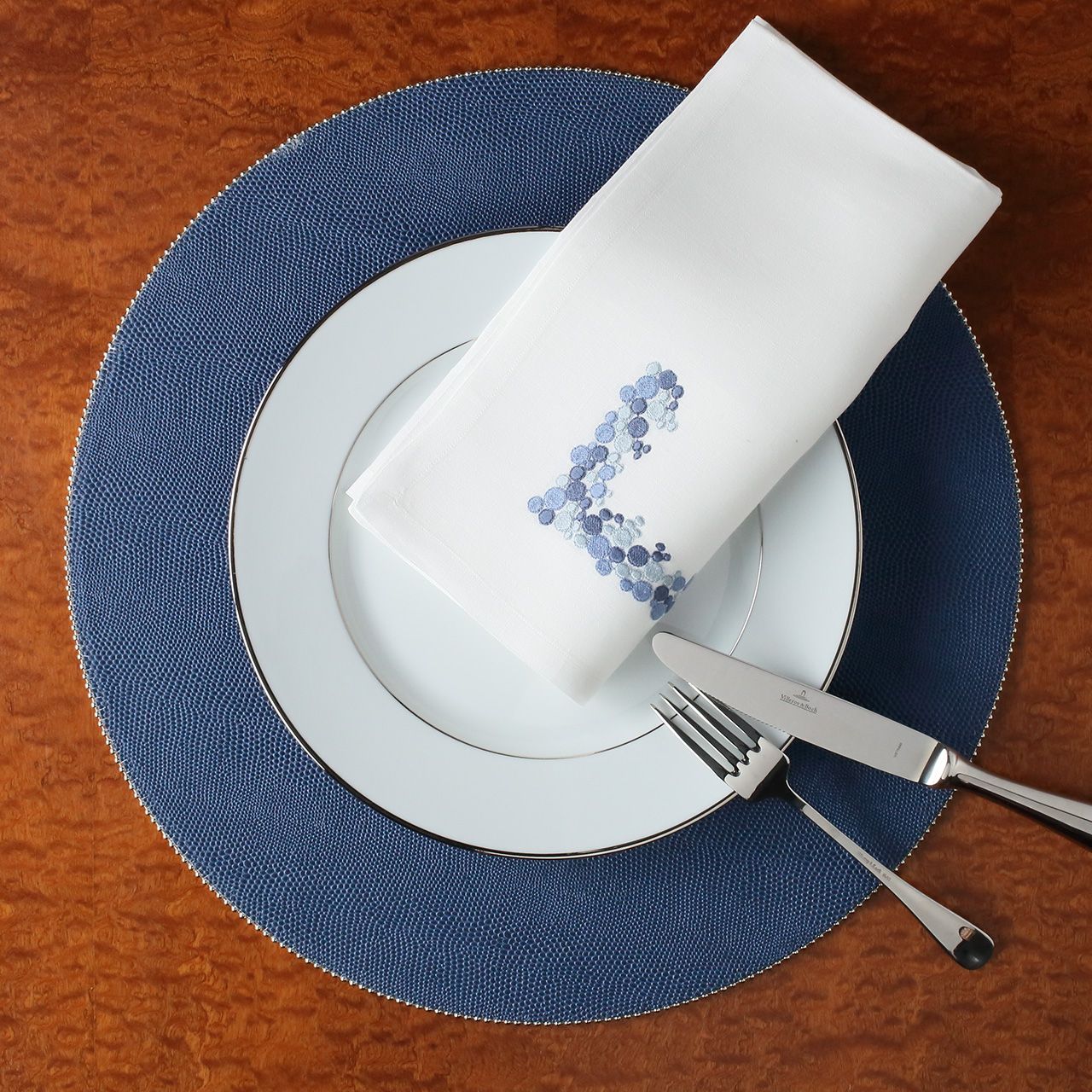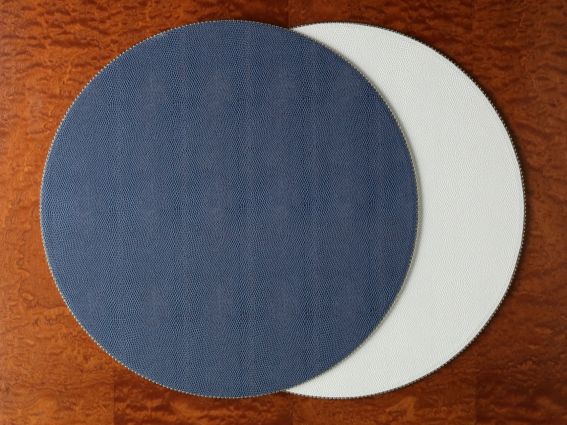 Every table needs a touch of elegance be it for casual or more formal dining. These hard placemats provide exactly that with striking textures and au courant colors with the added advantage of being easy to clean. MOXIE Round reverses from Blue Ink to White with a White braid border. Shown with BOLLICINE linen napkin. BOLLICINE cocktail napkins are available in stock and by special order.