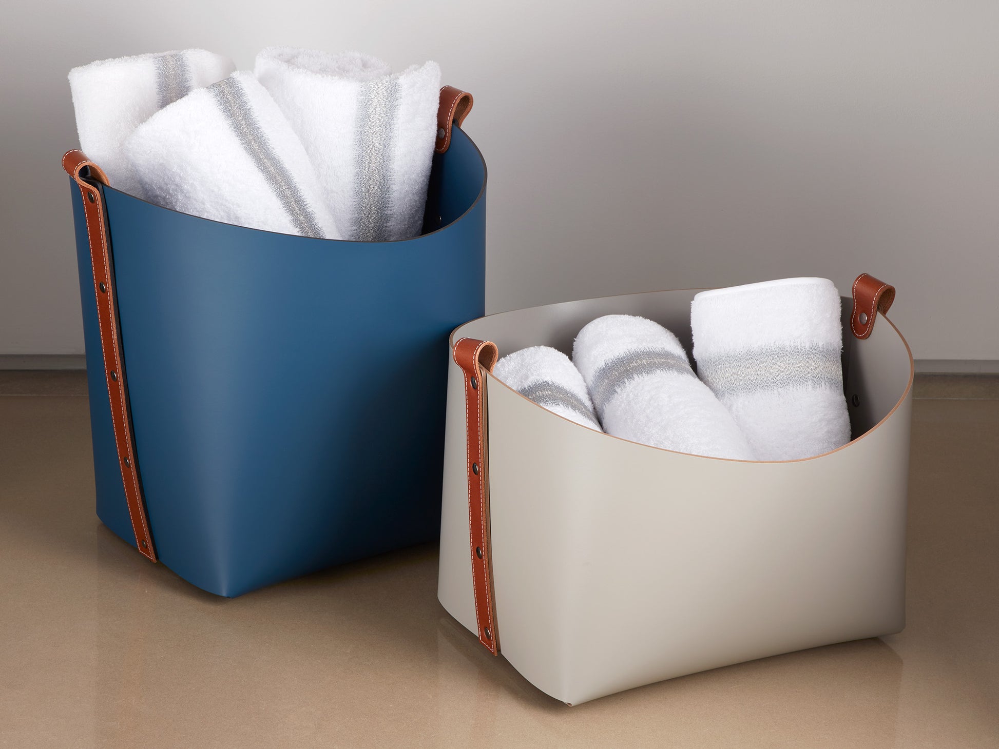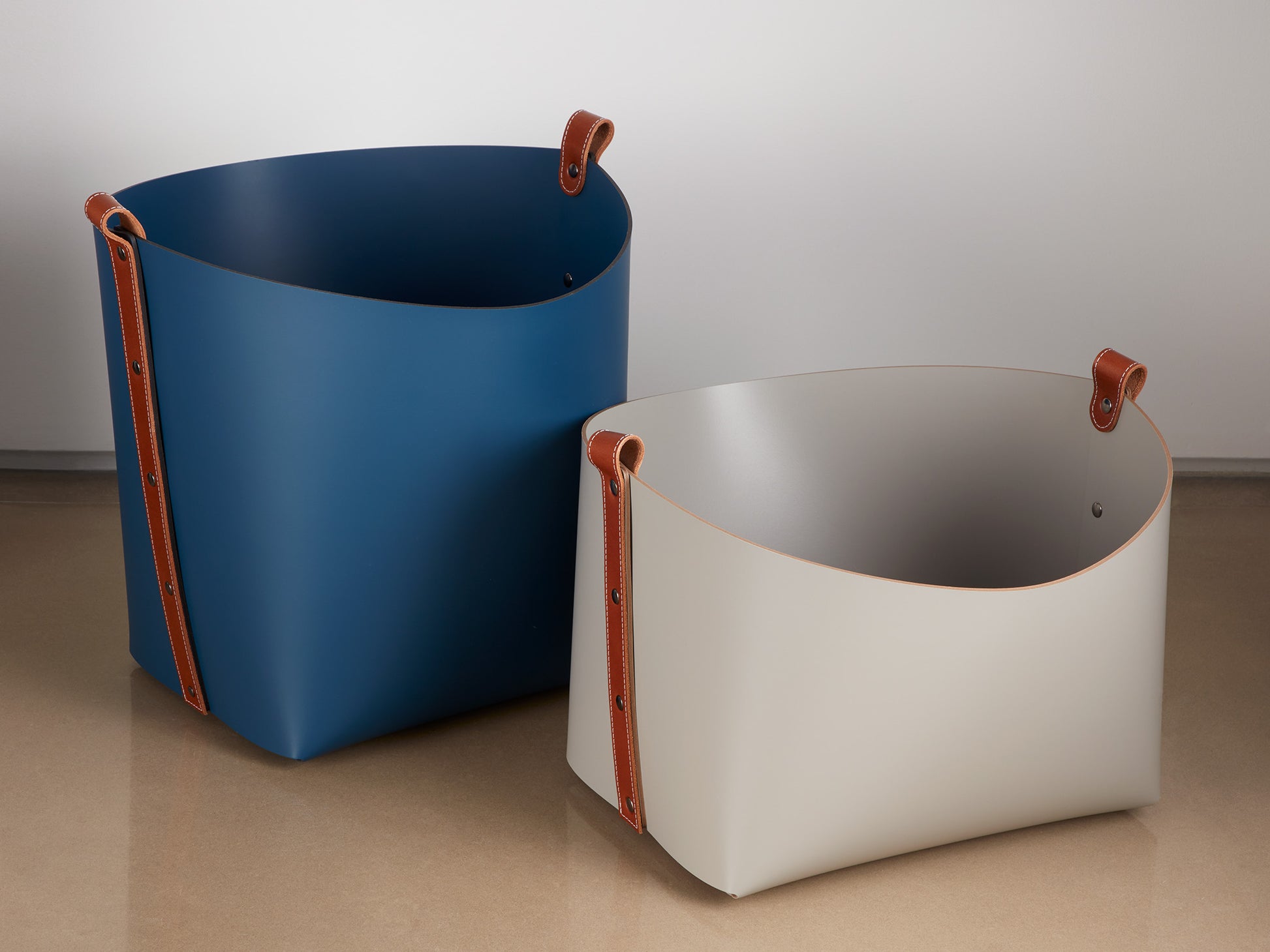 The unstructured silhouette of the OVO basket with its flared sides, sturdy base and handles is simultaneously striking and utilitarian. Crafted in Italy of eco-friendly, water resistant, and washable smooth bonded leather and available in a variety of neutral colors. Suitable for indoor and outdoor use.