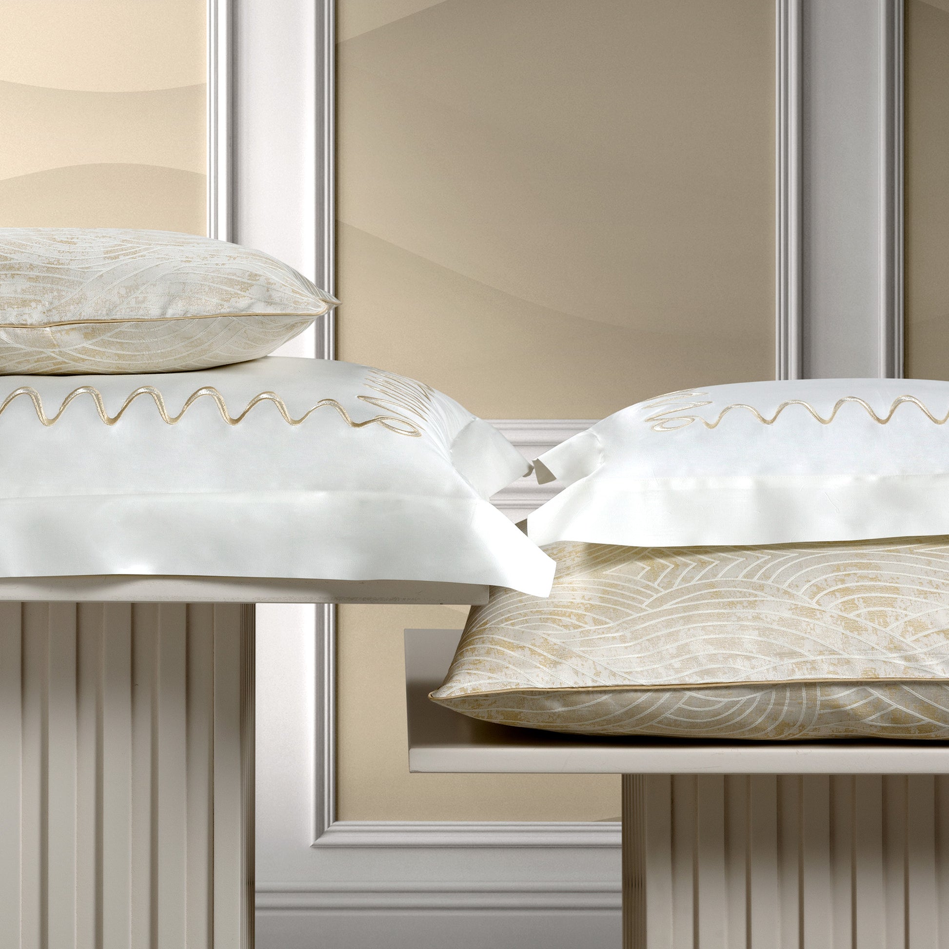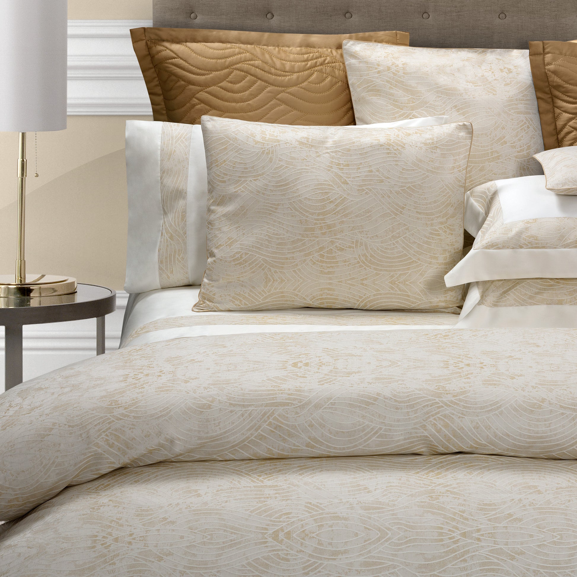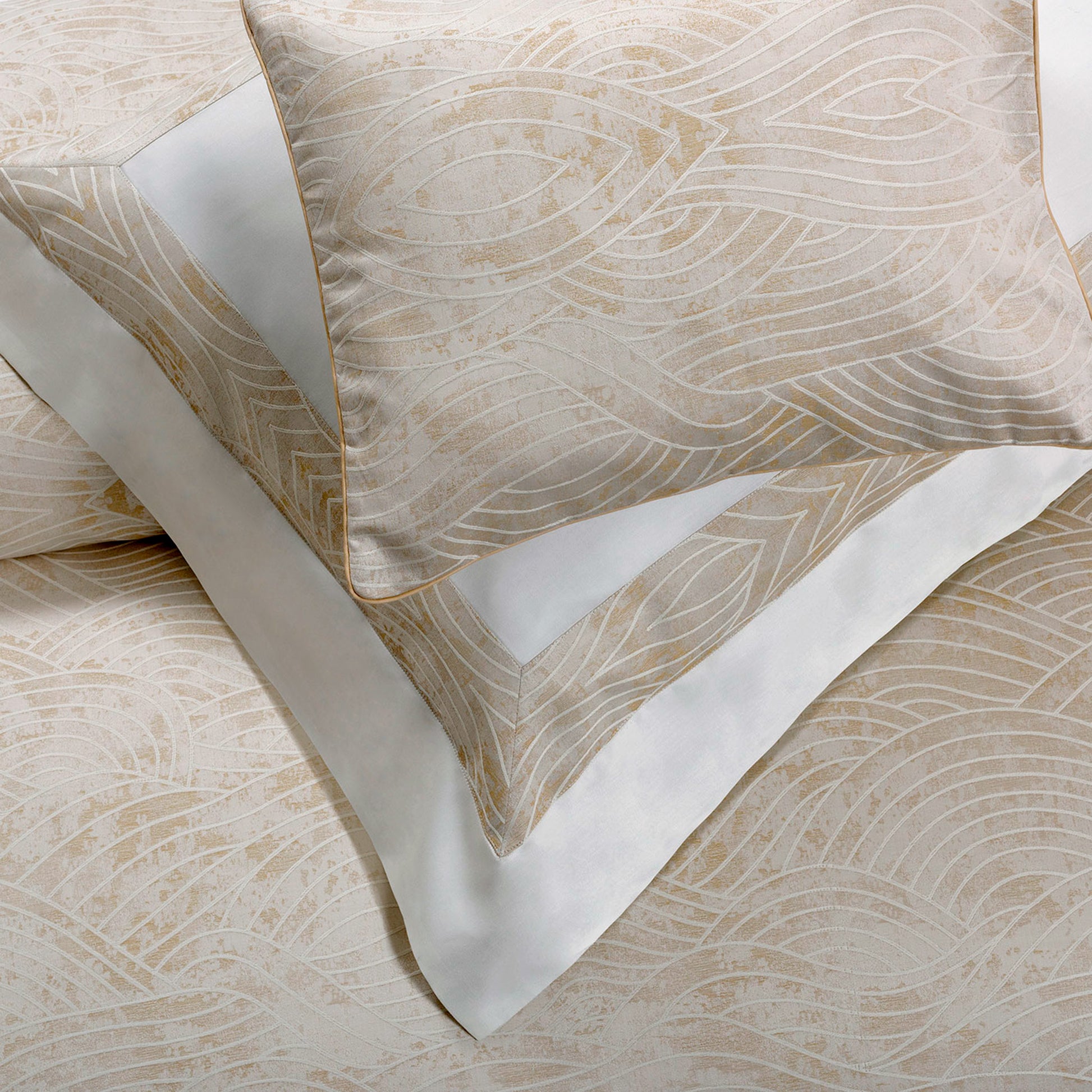 A design inspired by nature. Undulating waves create a series of intriguing patterns in PELAGO by Timothy Corrigan for Dea which are woven directly into the lustrous dappled Jacquard weave of the fabric. PELAGO is also available in coordinating embroidered bed linen and a quilted coverlet.