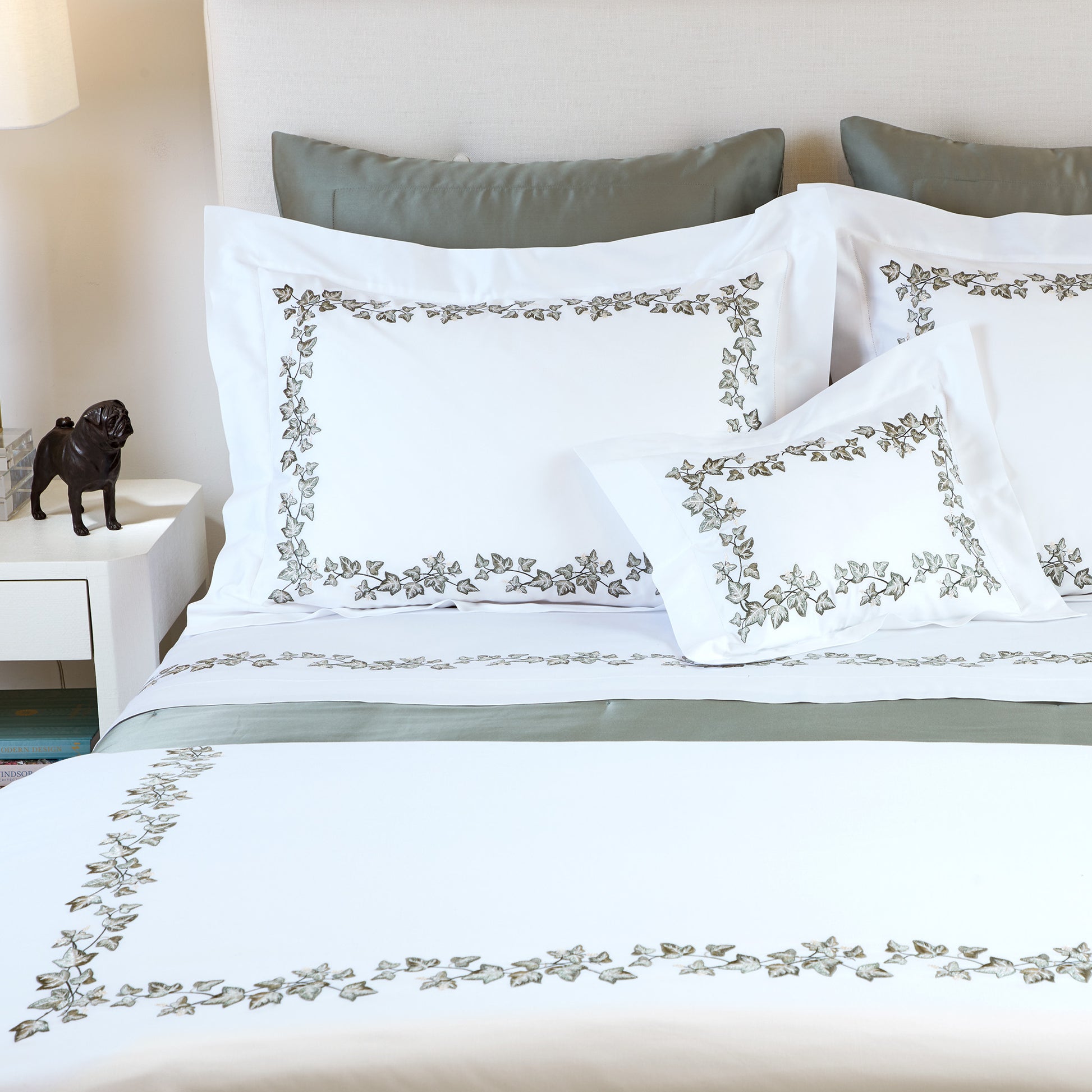 EDERA is a blissful nod to dreams of a Tuscan garden enveloped in lush green ivy. Embroidered on 300 TC cotton sateen.