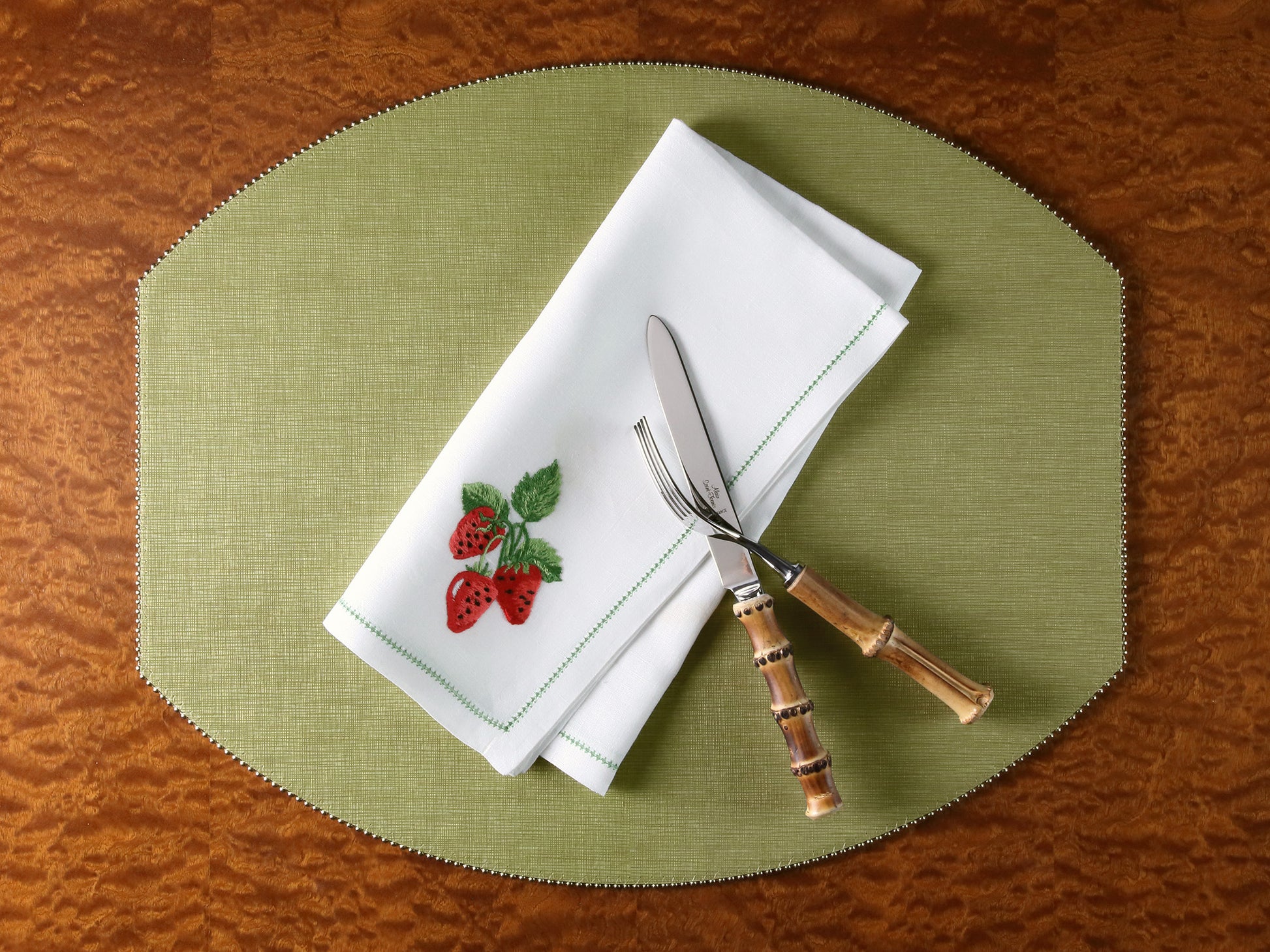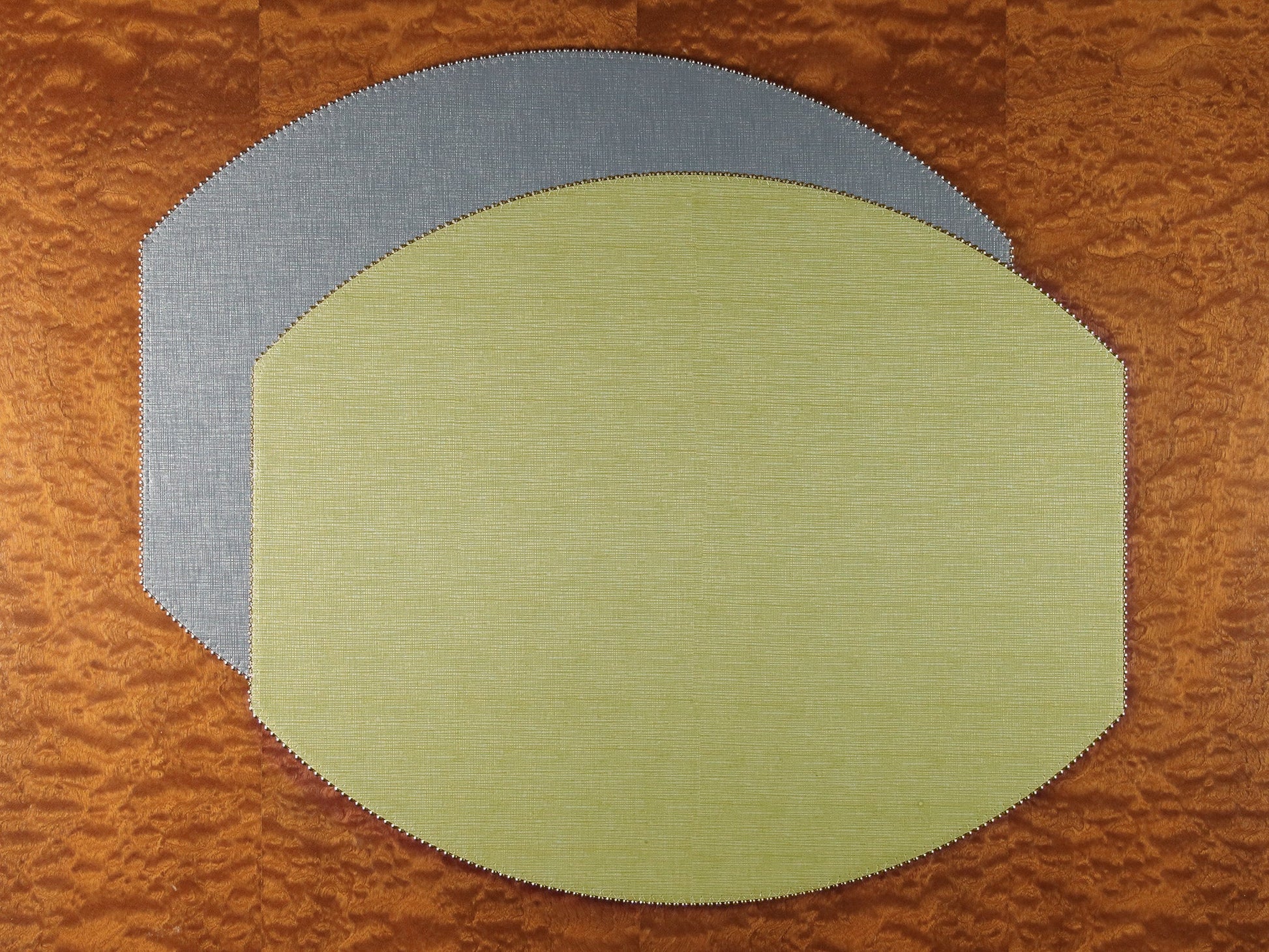 Every table needs a touch of elegance be it for casual or more formal dining. These hard placemats provide exactly that with striking textures and au courant colors with the added advantage of being easy to clean. TRAVERSE Ellipse Rectangle reverses from Ocean Blue to Evergreen with a Stainless-Steel ball chain border. Shown with FRUTTINE linen napkin.